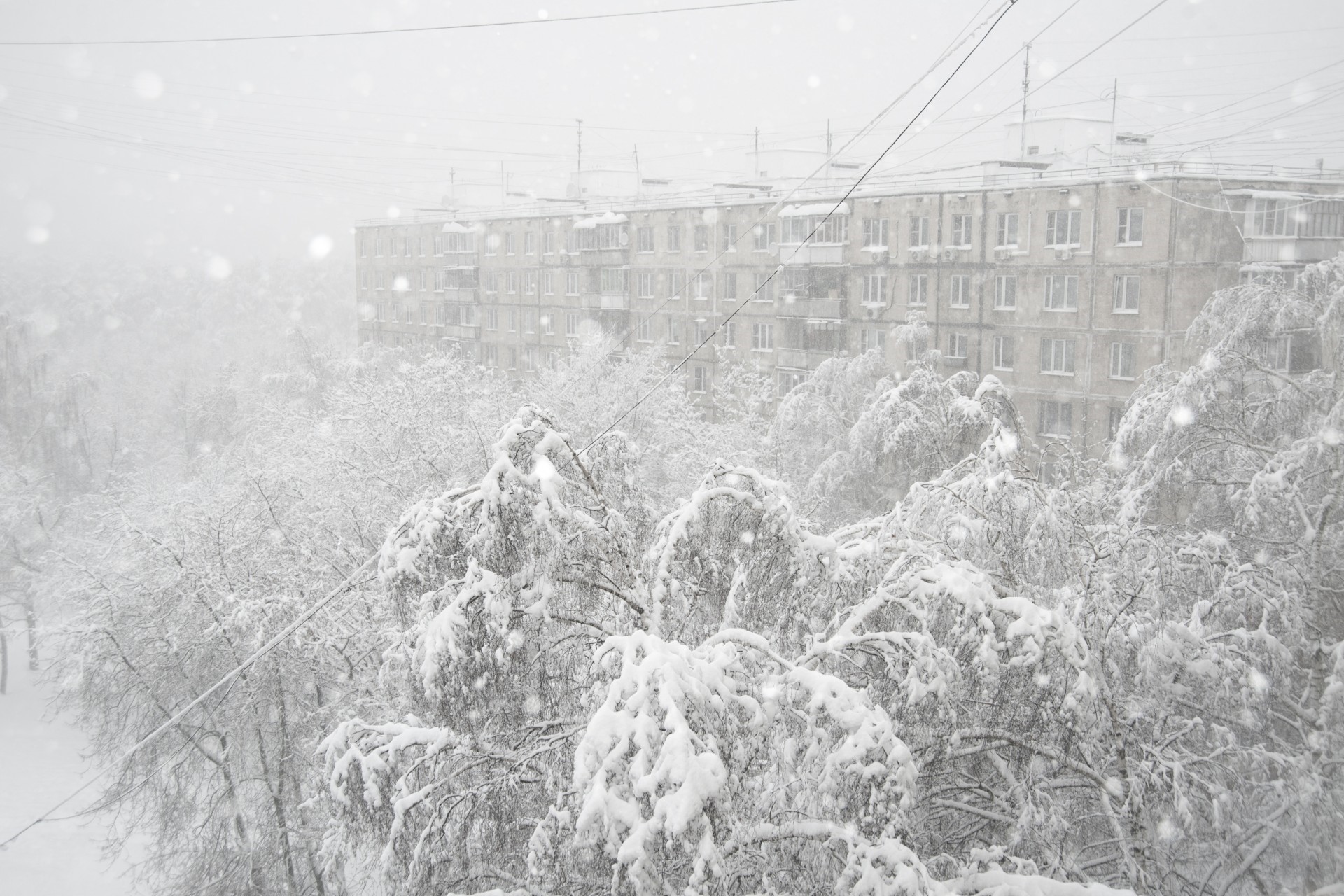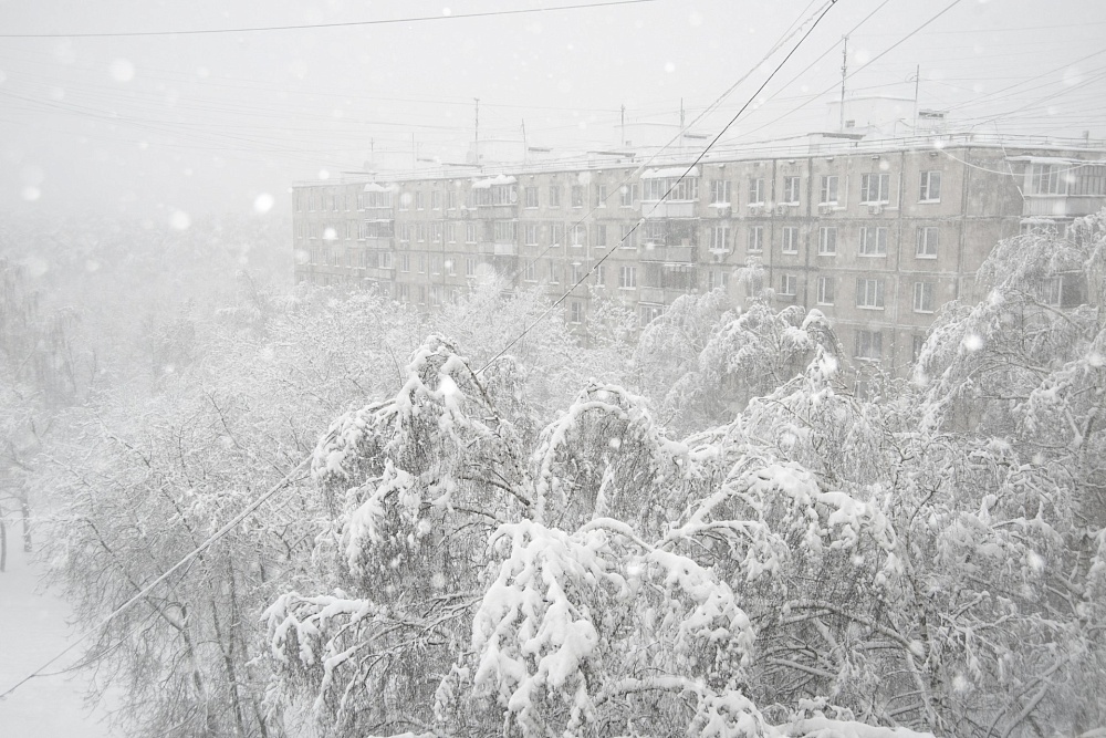 При снегопаде и сильном ветре зимой: