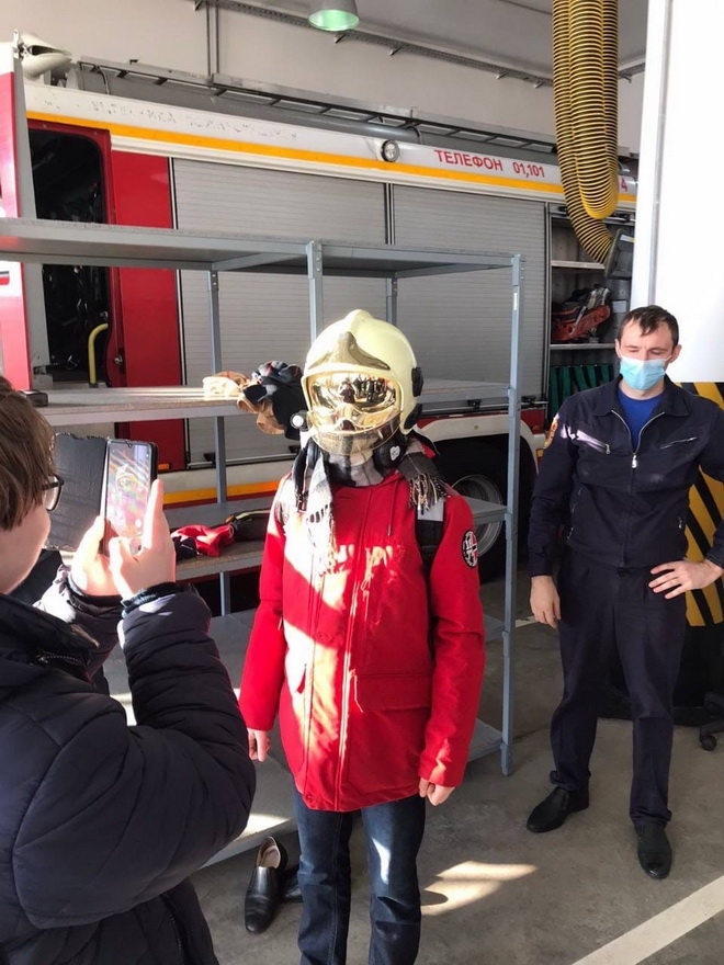 Ребятам удалось не только посмотреть, но и примерить боевую одежду пожарного, теплоотражающий костюм и средства индивидуальной защиты органов дыхания.